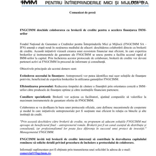 Fondul Național de Garantare a Creditelor pentru Întreprinderile Mici și Mijlocii (FNGCIMM SA – IFN) anunță o etapă nouă în susținerea mediului de afaceri: deschiderea colaborării directe cu brokerii de credite. Această inițiativă vizează crearea unui ecosistem financiar mai eficient, în care expertiza brokerilor și instrumentele de garantare ale FNGCIMM se unesc pentru a facilita […]